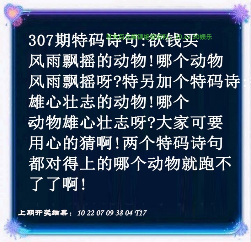 | 307期:九肖 | 羊马兔牛龙猪猴虎狗 | 开:狗20 |